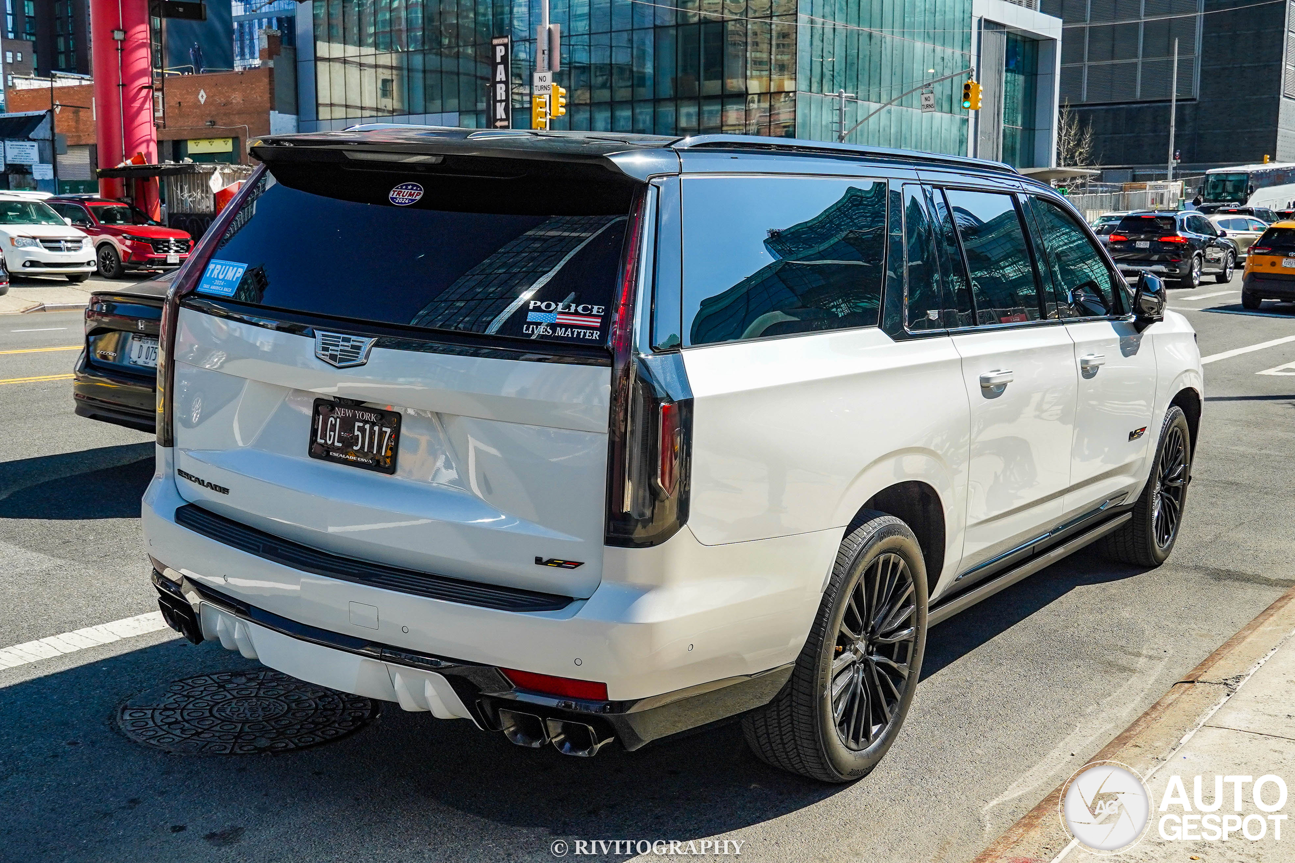 I found this two-tone 2024 Cadillac Escalade-V ESV parked on 11th Avenue on 4/12/2026. This would have been perfect if it wasn't for the stupid stickers on the back window.